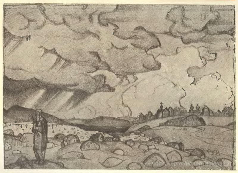 Nous vous proposons une reproduction artisanale sur toile du célèbre tableau 'Procopius le juste supprime un nuage de pierre du grand ustyug' de Nicholas Roerich, provenant du Musée de la Reproduction.