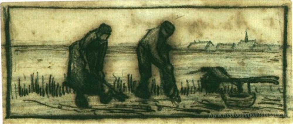 Nous vous proposons une reproduction artisanale sur toile du célèbre tableau 'Récolte de pommes de terre avec deux chiffres' de Vincent van Gogh, provenant du Musée de la Reproduction.