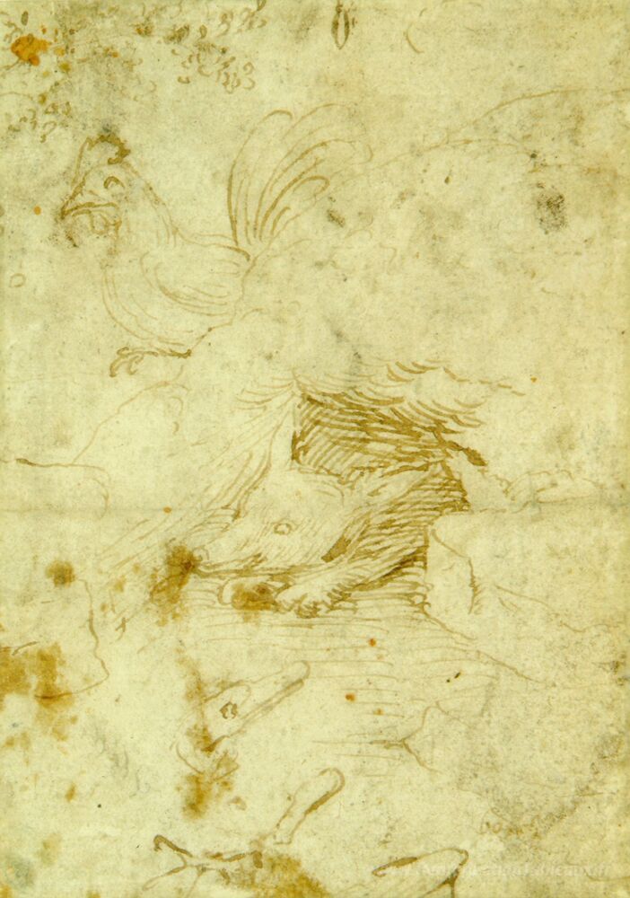 Nous vous proposons une reproduction artisanale sur toile du célèbre tableau 'Renard et coq' de Hieronymus Bosch, provenant du Musée de la Reproduction.