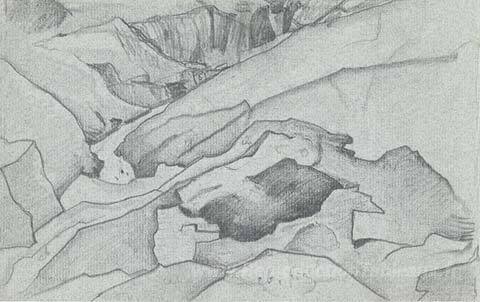 Nous vous proposons une reproduction artisanale sur toile du célèbre tableau 'Rivière Rani Nulla du côté Kulu du col de Rohtang' de Nicholas Roerich, provenant du Musée de la Reproduction.
