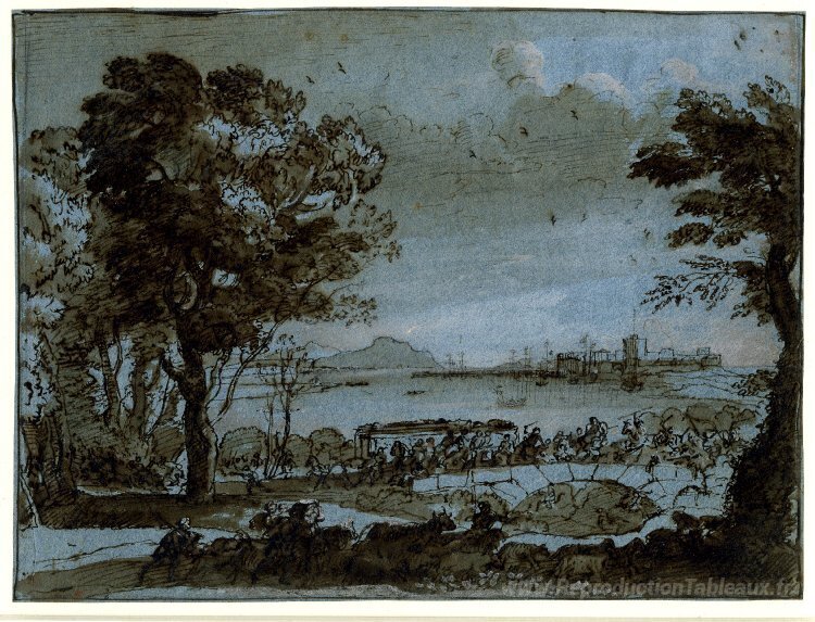 Nous vous proposons une reproduction artisanale sur toile du célèbre tableau 'Scène de la côte avec une bataille sur un pont' de Claude Lorrain, provenant du Musée de la Reproduction.
