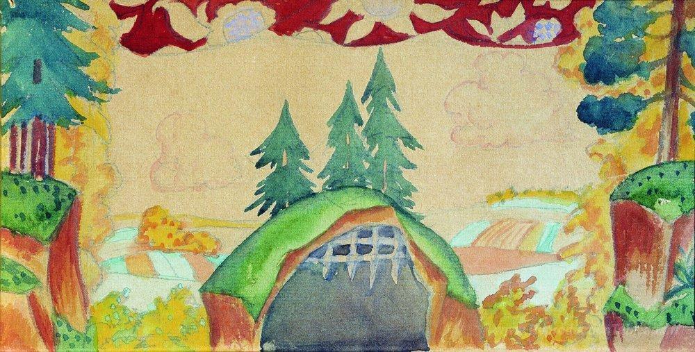 Nous vous proposons une reproduction artisanale sur toile du célèbre tableau 'Schizzo di decorazioni per spettacolo di burattini "Il Gallo - G' de Boris Kustodiev, provenant du Musée de la Reproduction.
