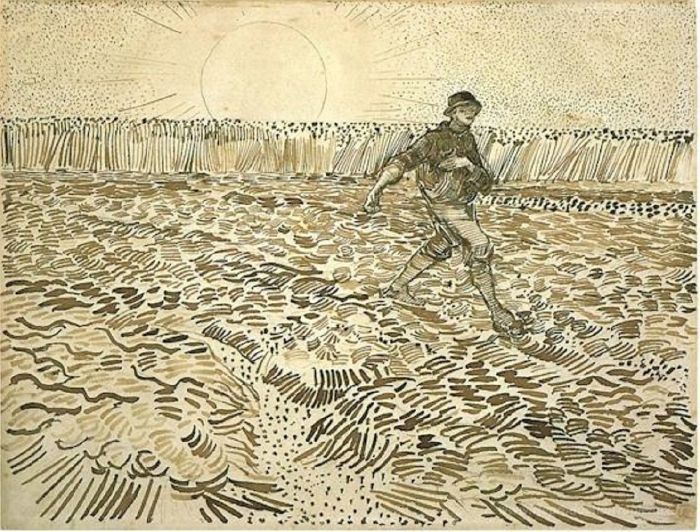Nous vous proposons une reproduction artisanale sur toile du célèbre tableau 'Semer avec le soleil couchant' de Vincent van Gogh, provenant du Musée de la Reproduction.