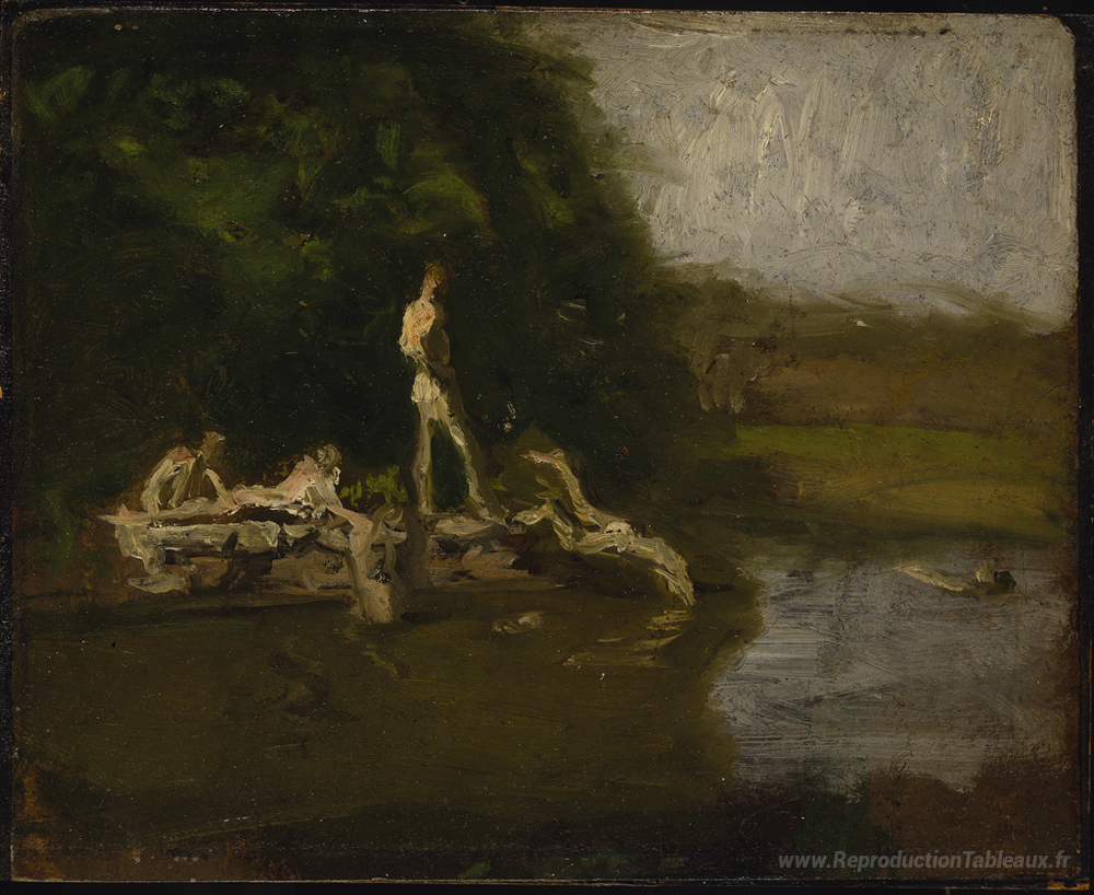 Nous vous proposons une reproduction artisanale sur toile du célèbre tableau 'Sketch du trou de baignade' de Thomas Eakins, provenant du Musée de la Reproduction.