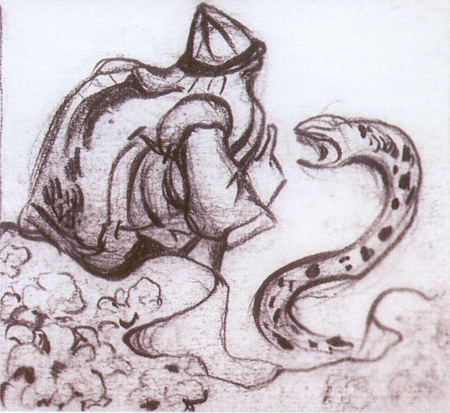 Nous vous proposons une reproduction artisanale sur toile du célèbre tableau 'Snakes face (chuchotant un serpent)' de Nicholas Roerich, provenant du Musée de la Reproduction.