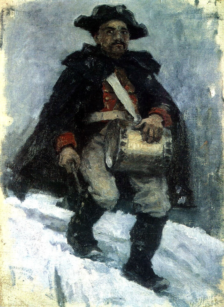 Nous vous proposons une reproduction artisanale sur toile du célèbre tableau 'Soldat avec du tambour' de Vasily Surikov, provenant du Musée de la Reproduction.