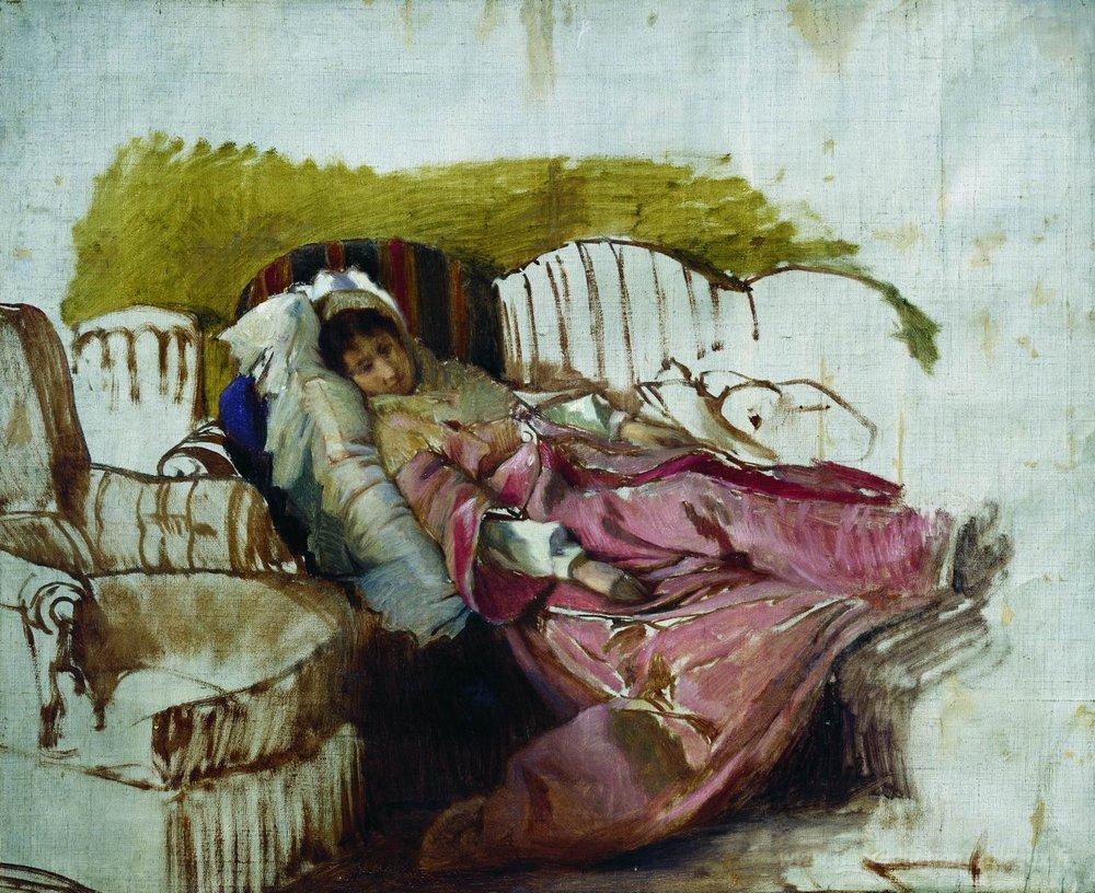 Nous vous proposons une reproduction artisanale sur toile du célèbre tableau 'Sur le divan' de Ilya Repin, provenant du Musée de la Reproduction.