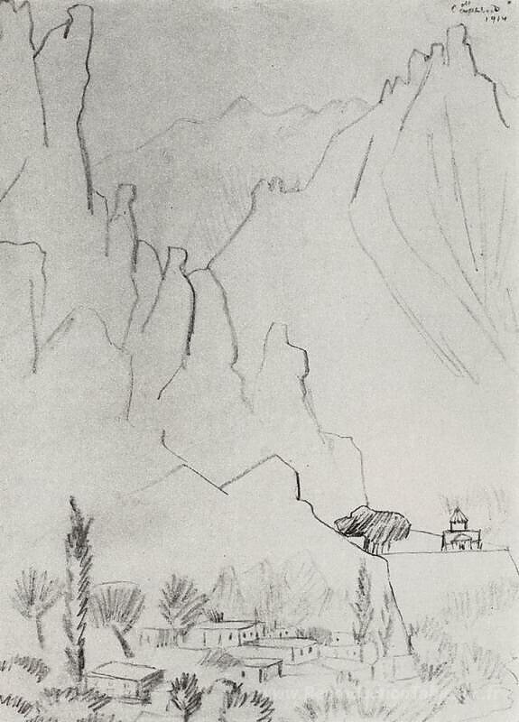 Nous vous proposons une reproduction artisanale sur toile du célèbre tableau 'Surb Khach' de Martiros Saryan, provenant du Musée de la Reproduction.