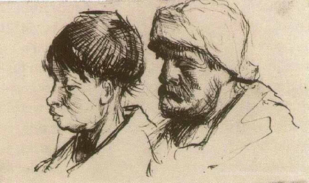 Nous vous proposons une reproduction artisanale sur toile du célèbre tableau 'Tête d'une fille, nue et tête d'un homme avec une barbe et une c' de Vincent van Gogh, provenant du Musée de la Reproduction.