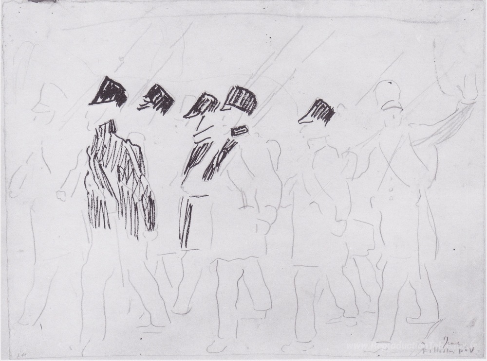 Nous vous proposons une reproduction artisanale sur toile du célèbre tableau 'Tirer les soldats' de Ferdinand Hodler, provenant du Musée de la Reproduction.