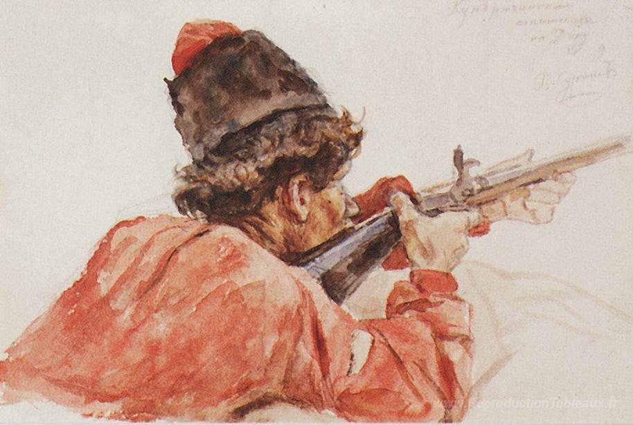 Nous vous proposons une reproduction artisanale sur toile du célèbre tableau 'Tirer sur Cossack' de Vasily Surikov, provenant du Musée de la Reproduction.