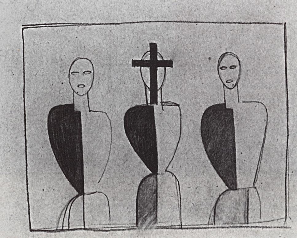 Nous vous proposons une reproduction artisanale sur toile du célèbre tableau 'Trois chiffres suprématiques' de Kazimir Malevich, provenant du Musée de la Reproduction.