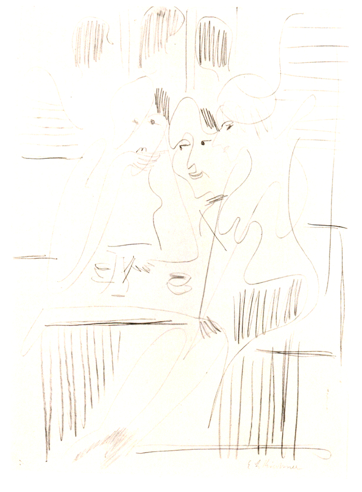 Découvrez la beauté saisissante de l'œuvre Trois femmes dans un café d’Ernst Ludwig Kirchner, un maître de l’expressionnisme allemand. Kirchner, figure emblématique du début du XXe siècle, a su capter l'essence de la vie moderne avec une palette vibrante et des traits audacieux. Son style unique, mêlant couleurs éclatantes et formes stylisées, suscite une émotion profonde, invitant le spectateur à plonger dans l'univers intime et vivant des personnages.