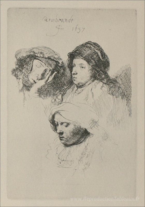 Nous vous proposons une reproduction artisanale sur toile du célèbre tableau 'Trois têtes féminines avec un dort' de Rembrandt, provenant du Musée de la Reproduction.