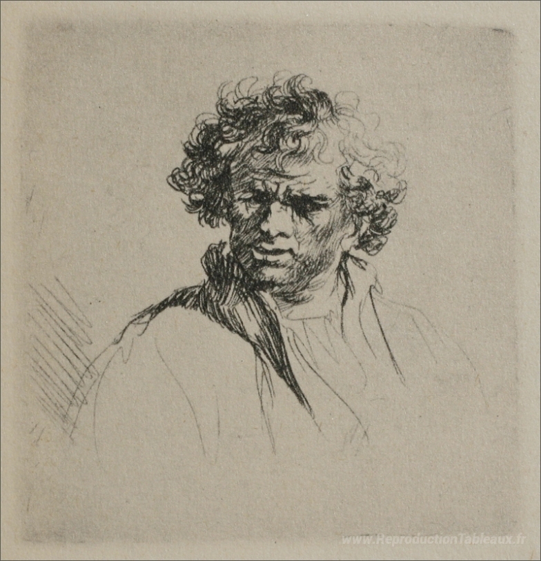 Nous vous proposons une reproduction artisanale sur toile du célèbre tableau 'Un homme aux cheveux bouclés' de Rembrandt, provenant du Musée de la Reproduction.