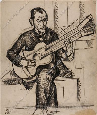 Nous vous proposons une reproduction artisanale sur toile du célèbre tableau 'Un homme avec une guitare' de Pyotr Konchalovsky, provenant du Musée de la Reproduction.