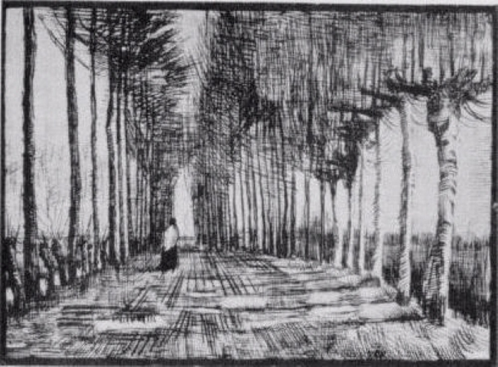 Nous vous proposons une reproduction artisanale sur toile du célèbre tableau 'Voie avec arbres et une figure' de Vincent van Gogh, provenant du Musée de la Reproduction.