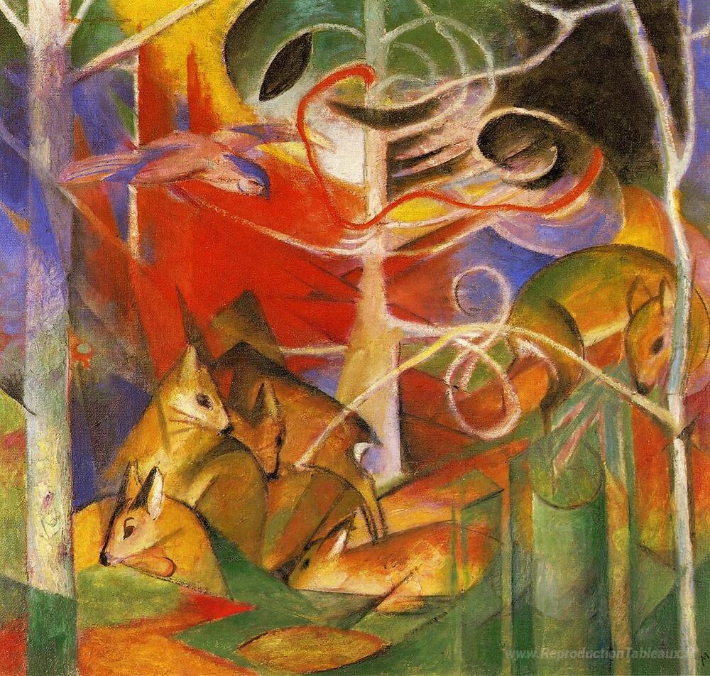 Nous vous proposons une reproduction artisanale sur toile du célèbre tableau 'Cerf dans la forêt' de Franz Marc, provenant du Musée de la Reproduction.