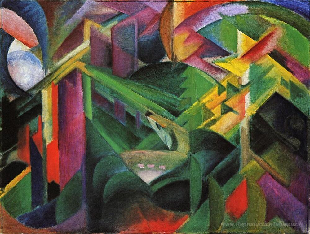 Nous vous proposons une reproduction artisanale sur toile du célèbre tableau 'Cerf dans un jardin de monastère' de Franz Marc, provenant du Musée de la Reproduction.