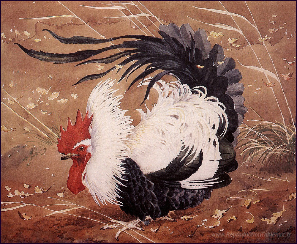 Nous vous proposons une reproduction artisanale sur toile du célèbre tableau 'Coq dans le vent' de Charles Tunnicliffe, provenant du Musée de la Reproduction.