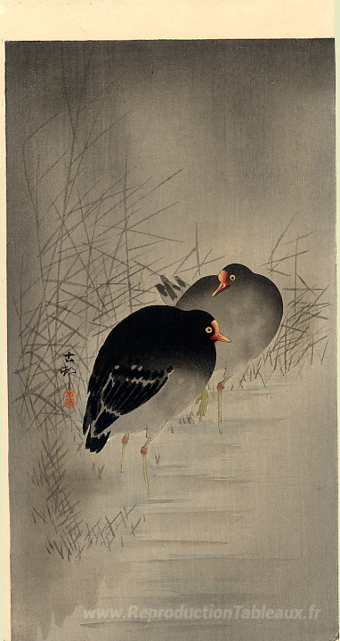 Nous vous proposons une reproduction artisanale sur toile du célèbre tableau 'Deux gallinules' de Ohara Koson, provenant du Musée de la Reproduction.