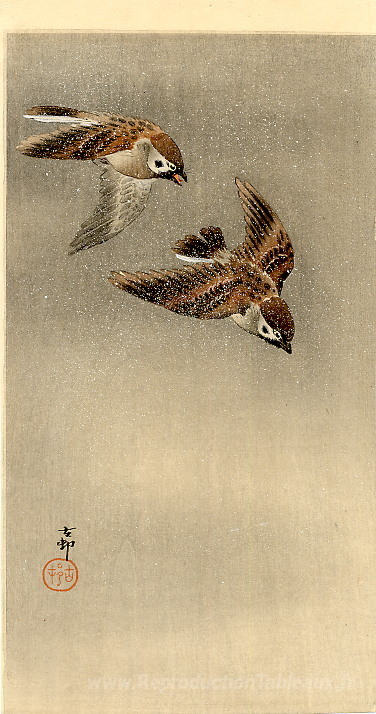 Nous vous proposons une reproduction artisanale sur toile du célèbre tableau 'Deux moineaux en vol' de Ohara Koson, provenant du Musée de la Reproduction.