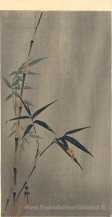 Nous vous proposons une reproduction artisanale sur toile du célèbre tableau 'Escargot sur la feuille de bambou' de Ohara Koson, provenant du Musée de la Reproduction.