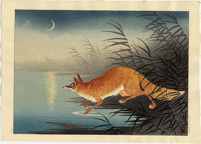 Nous vous proposons une reproduction artisanale sur toile du célèbre tableau 'Fox dans les roseaux' de Ohara Koson, provenant du Musée de la Reproduction.
