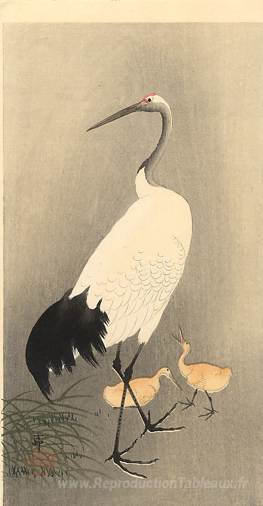 Nous vous proposons une reproduction artisanale sur toile du célèbre tableau 'Grue couronnée rouge' de Ohara Koson, provenant du Musée de la Reproduction.