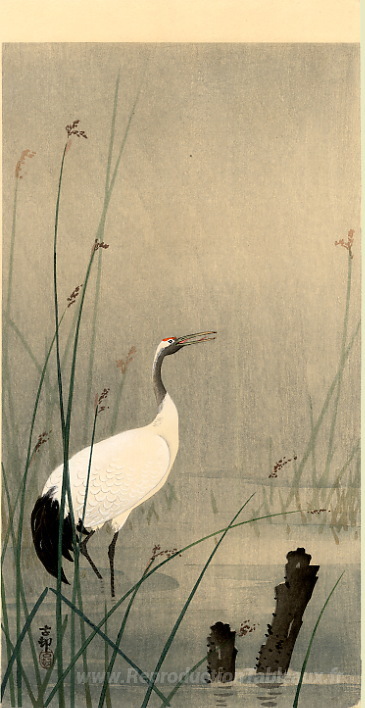 Nous vous proposons une reproduction artisanale sur toile du célèbre tableau 'Grue dans une petite eau' de Ohara Koson, provenant du Musée de la Reproduction.