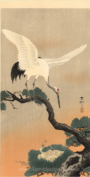 Nous vous proposons une reproduction artisanale sur toile du célèbre tableau 'Grue sur son nid' de Ohara Koson, provenant du Musée de la Reproduction.