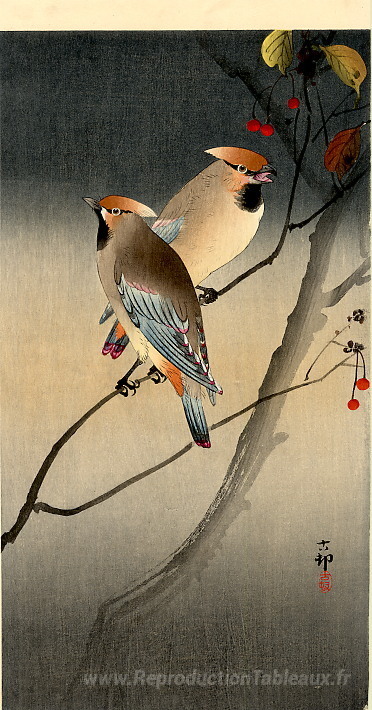 Nous vous proposons une reproduction artisanale sur toile du célèbre tableau 'Jays sur des baies' de Ohara Koson, provenant du Musée de la Reproduction.