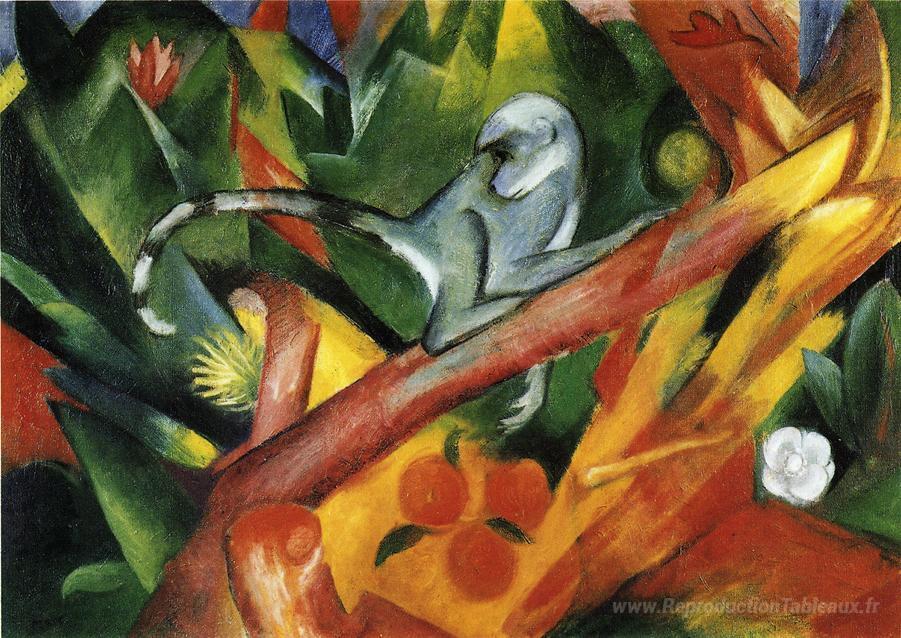 Nous vous proposons une reproduction artisanale sur toile du célèbre tableau 'Le singe' de Franz Marc, provenant du Musée de la Reproduction.