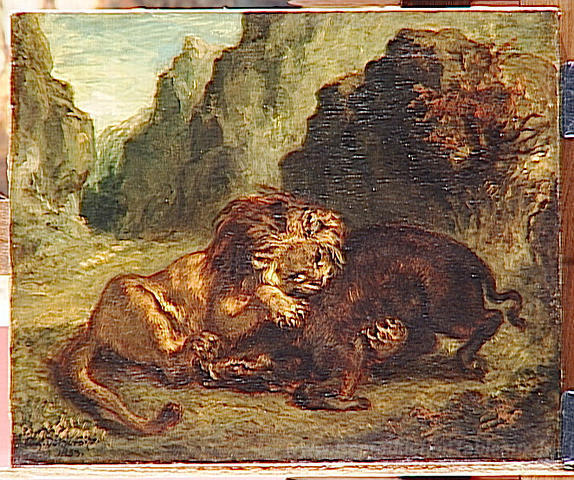 Nous vous proposons une reproduction artisanale sur toile du célèbre tableau 'Lion et sanglier' de Eugene Delacroix, provenant du Musée de la Reproduction.