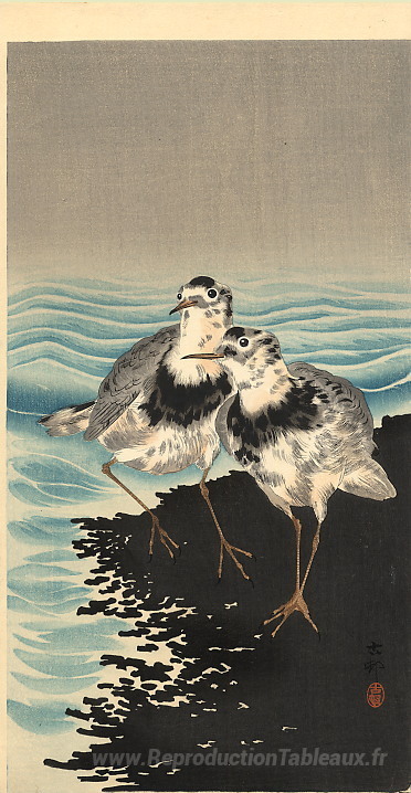Nous vous proposons une reproduction artisanale sur toile du célèbre tableau 'Nœuds sur le rivage' de Ohara Koson, provenant du Musée de la Reproduction.