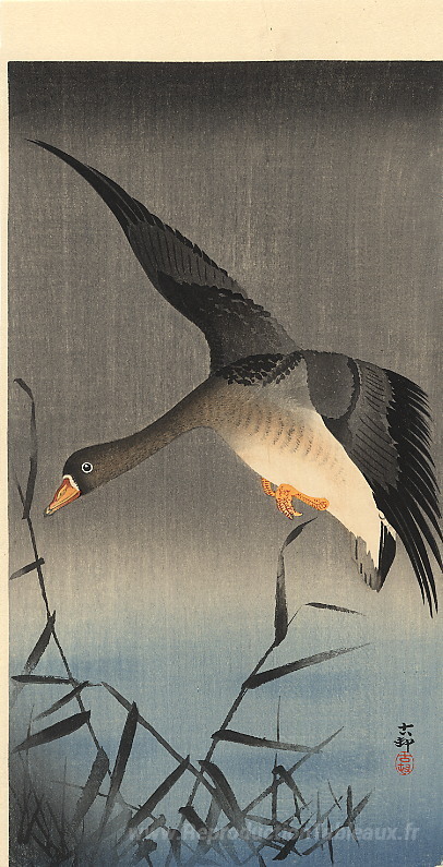 Nous vous proposons une reproduction artisanale sur toile du célèbre tableau 'Oie à front blanc descendant sur les roseaux' de Ohara Koson, provenant du Musée de la Reproduction.