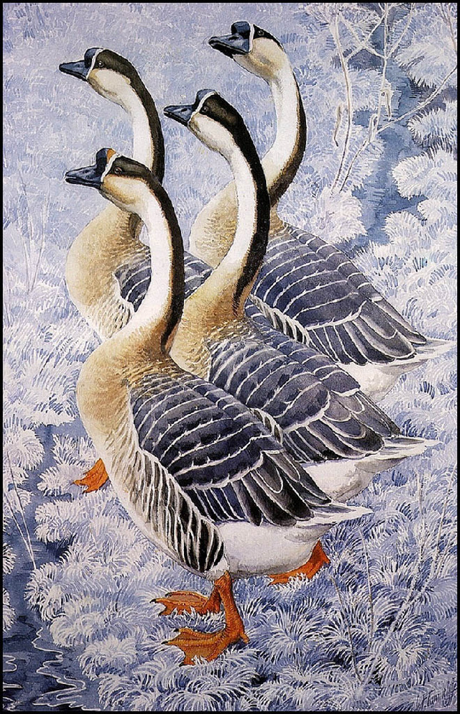 Nous vous proposons une reproduction artisanale sur toile du célèbre tableau 'Oies chinoises' de Charles Tunnicliffe, provenant du Musée de la Reproduction.