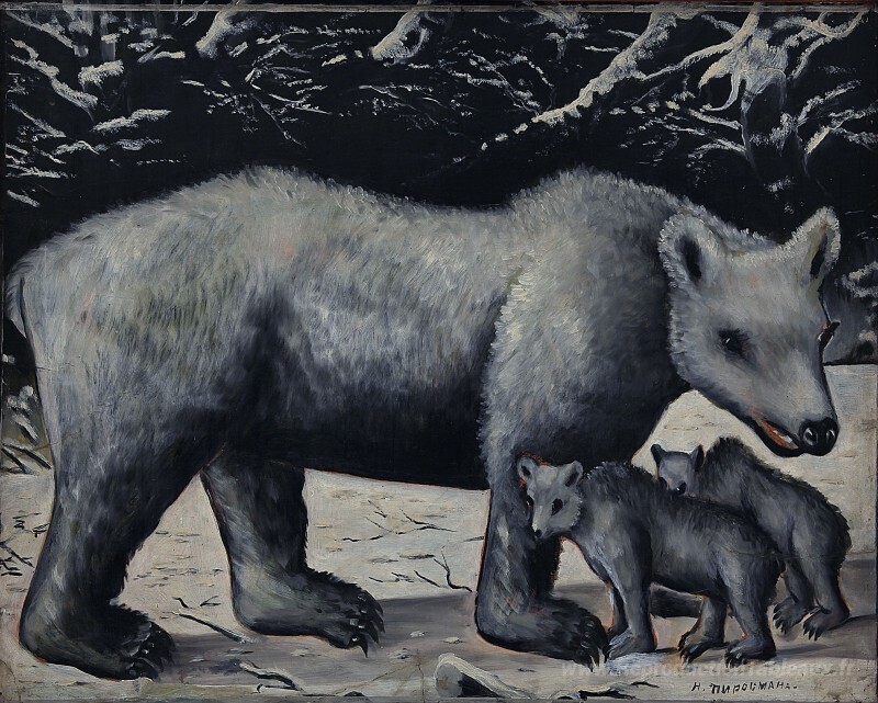Nous vous proposons une reproduction artisanale sur toile du célèbre tableau 'Ours blanc avec ses petits' de Niko Pirosmani, provenant du Musée de la Reproduction.