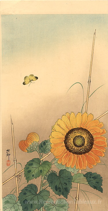 Nous vous proposons une reproduction artisanale sur toile du célèbre tableau 'Petit papillon et tournesol' de Ohara Koson, provenant du Musée de la Reproduction.