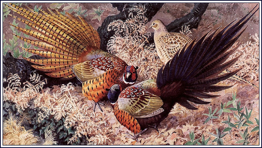 Nous vous proposons une reproduction artisanale sur toile du célèbre tableau 'Phéans à col annulaire' de Charles Tunnicliffe, provenant du Musée de la Reproduction.