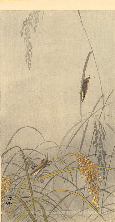 Nous vous proposons une reproduction artisanale sur toile du célèbre tableau 'Sauterelles sur les plantes de riz' de Ohara Koson, provenant du Musée de la Reproduction.