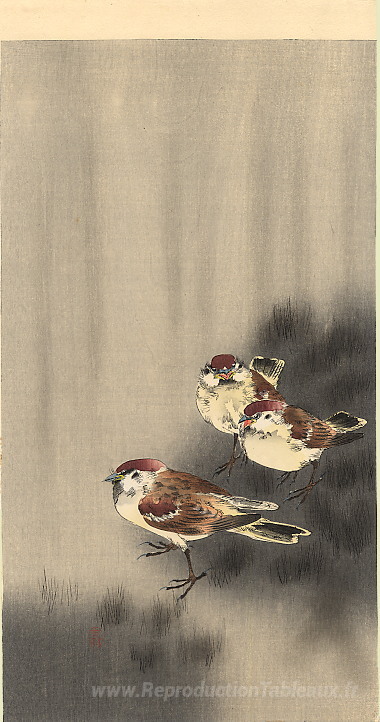 Nous vous proposons une reproduction artisanale sur toile du célèbre tableau 'Trois moineaux d'arbres dans une douche à pluie' de Ohara Koson, provenant du Musée de la Reproduction.