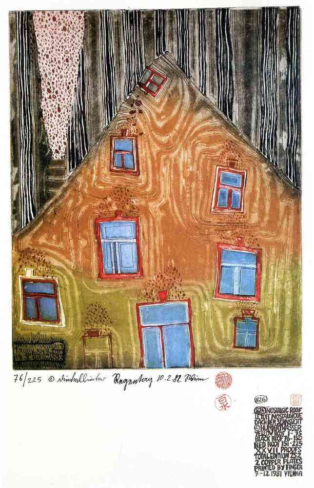 Nous vous proposons une reproduction artisanale sur toile du célèbre tableau '826 toit nostalgique' de Friedensreich Hundertwasser, provenant du Musée de la Reproduction.