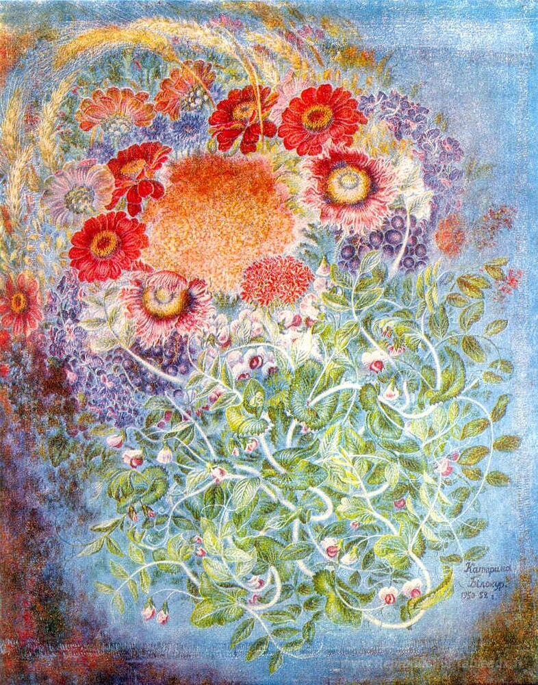 Nous vous proposons une reproduction artisanale sur toile du célèbre tableau 'Blé, fleurs, raisins' de Kateryna Bilokur, provenant du Musée de la Reproduction.