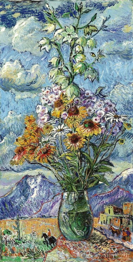 Nous vous proposons une reproduction artisanale sur toile du célèbre tableau 'Bouquet et montagnes, Colorado' de David Burliuk, provenant du Musée de la Reproduction.