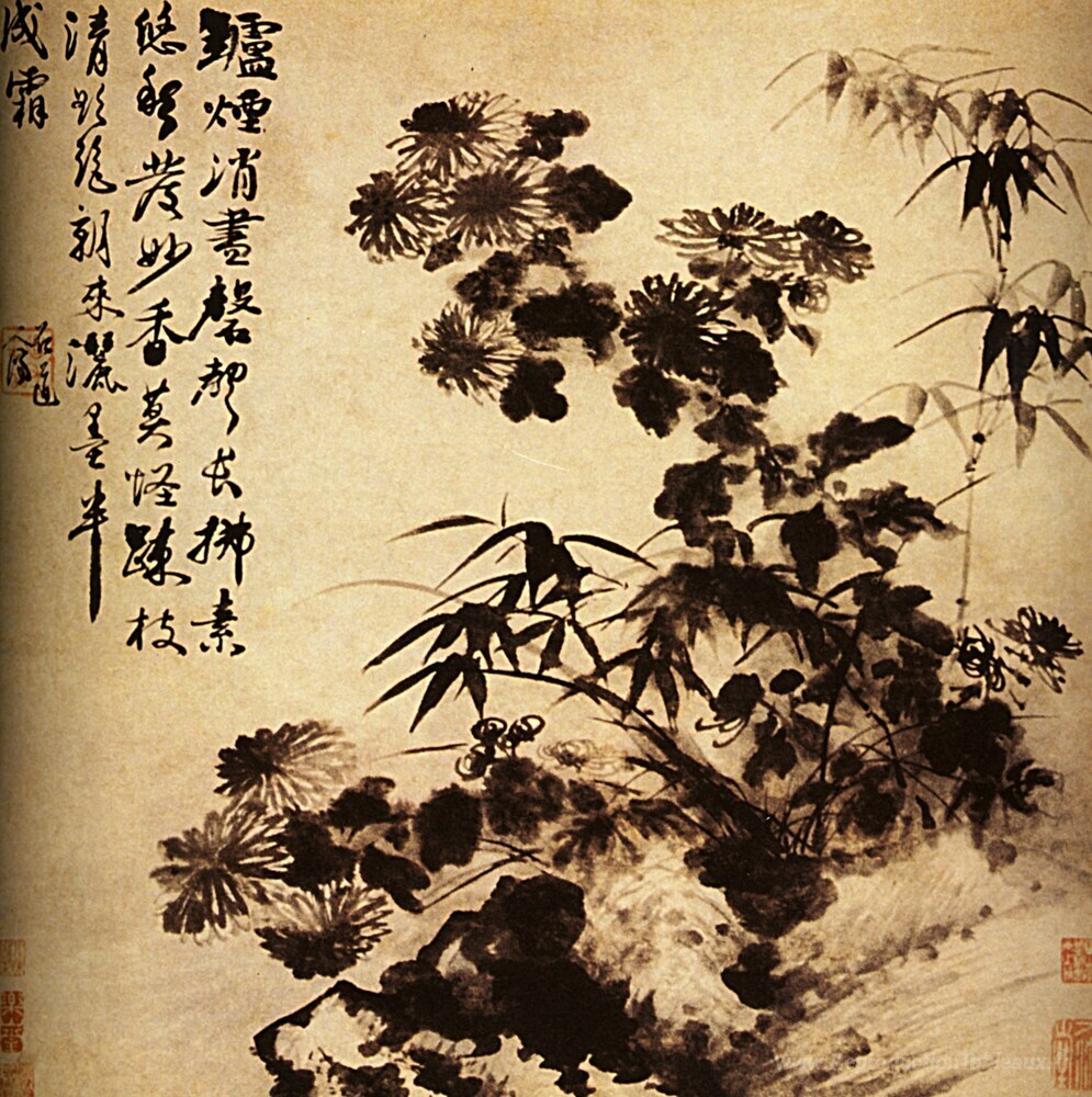 Nous vous proposons une reproduction artisanale sur toile du célèbre tableau 'Chrysanthèmes et bambou' de Shitao, provenant du Musée de la Reproduction.