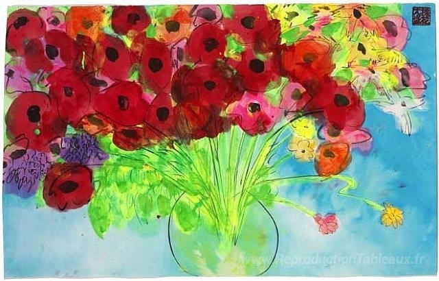 Nous vous proposons une reproduction artisanale sur toile du célèbre tableau 'Coquelicots' de Walasse Ting, provenant du Musée de la Reproduction.