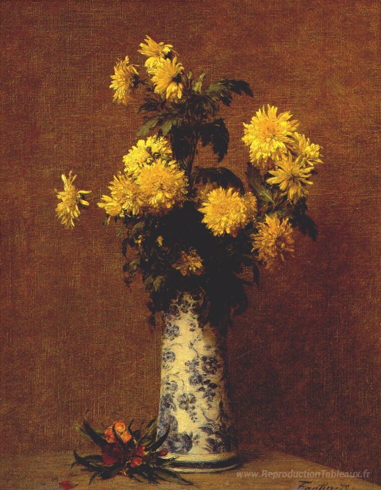 Nous vous proposons une reproduction artisanale sur toile du célèbre tableau 'Crisantemi' de Henri Fantin-Latour, provenant du Musée de la Reproduction.