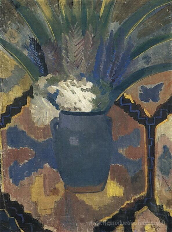Nous vous proposons une reproduction artisanale sur toile du célèbre tableau 'Des fleurs sur le fond du tapis' de Martiros Saryan, provenant du Musée de la Reproduction.