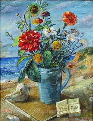 Nous vous proposons une reproduction artisanale sur toile du célèbre tableau 'Fleurs au bord de la mer' de David Burliuk, provenant du Musée de la Reproduction.